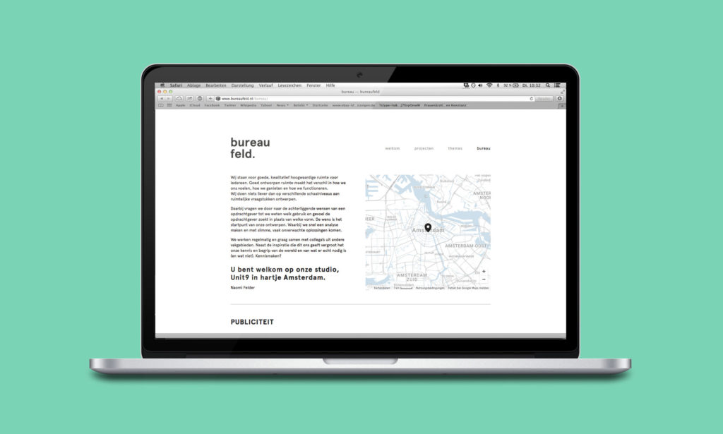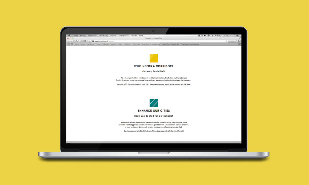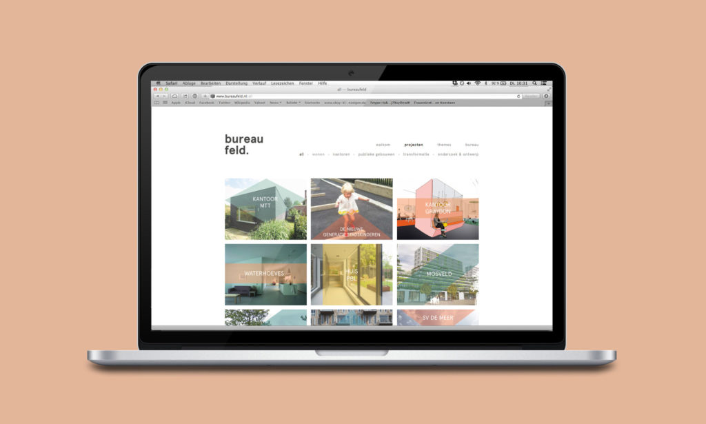 Die niederländische Architektin Naomi Felder hat ein breites Portfolio. Zwischen all den verschiedenen Arbeitsbereichen musste eine klare Struktur geschaffen werden, damit schnell erkennbar ist, welcher Rubrik einer Arbeit angehört. Es wurde ein komplexes Formensystem entworfen, welches verschiedene Arbeitsbereiche kategorisiert. Die Flexibilität der Architektin, sollten in die Gestaltung übertragen werden. Diese Arbeit entstand in Zusammenarbeit mit kazeze aus Amsterdam.